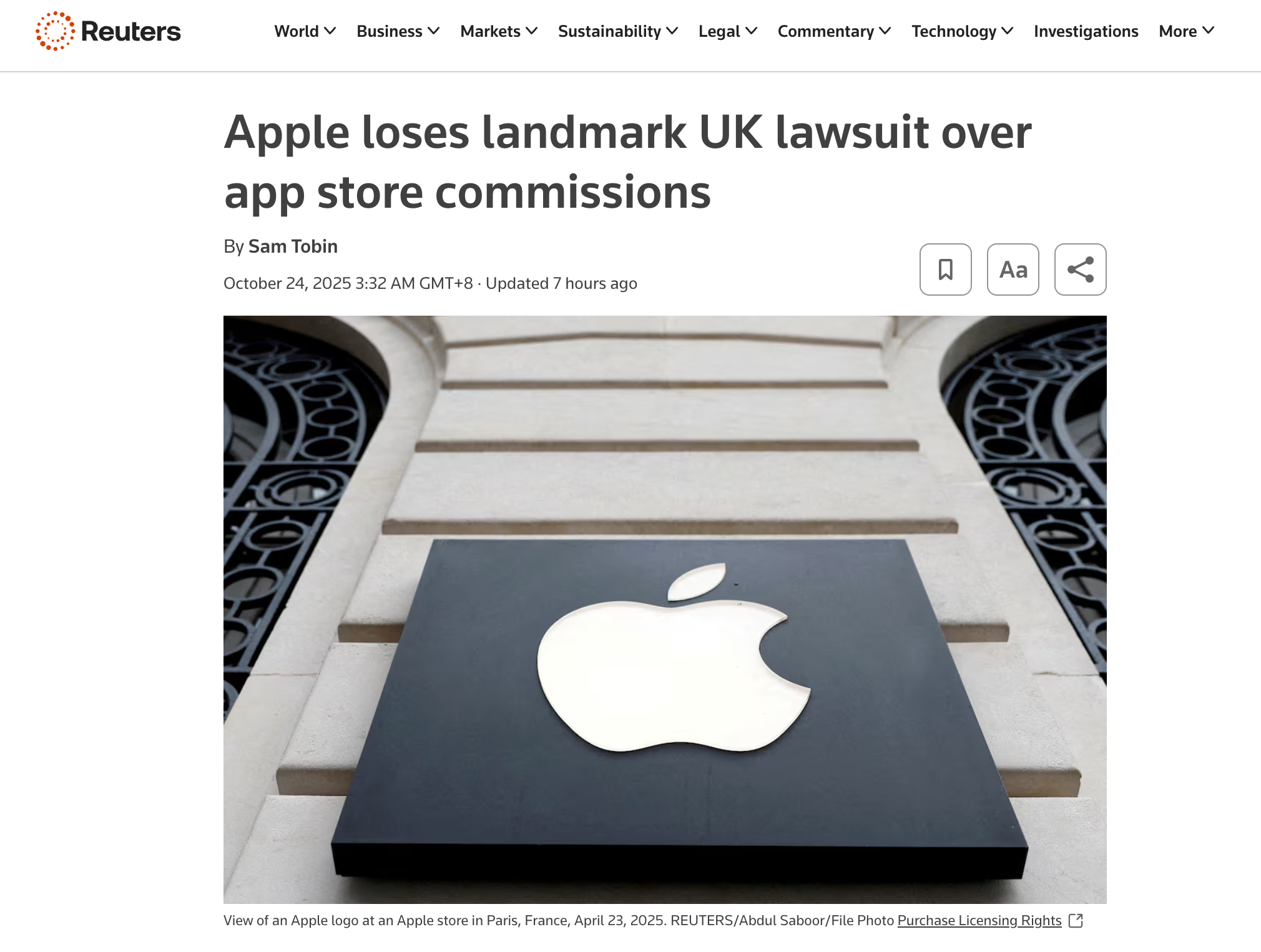 英国竞争上诉法庭裁定,苹果确实滥用其市场主导地位,向应用开发者收取不公平的佣金。下个月举行的听证会上,将确定苹果最终的赔偿金额。值得注意的是,苹果已回应上述判决,表示法庭“忽视了App Store如何帮助开发者取得成功,以及如何为消费者提供一个安全、可信赖的平台来发现应用和安全支付”。目前,苹果已提起上诉。